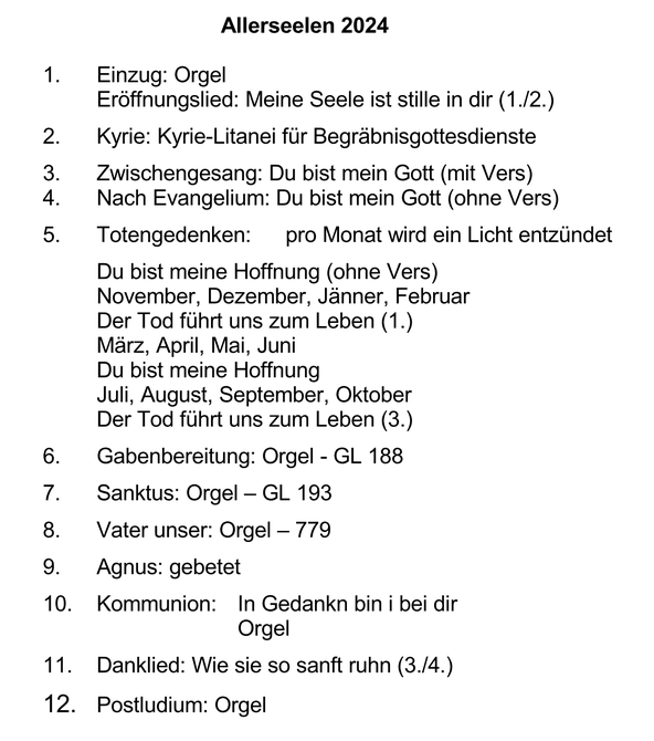 Festmesse Maria Empfängnis8. Dezember 20249:45 UhrPräludium: OrgelWeirich: IntroitusKyrie eleison nach „Yesterday“Gloria: Ehre sei GottZwischengesang: Dreo:A stille Zeit (1./2.)Nach der zweiten Lesung:GL 174/5 + Ruf vor dem Evangeliumnach dem Ev.: GL 174/5Credo: gebetetGabenbereitung: GL 183Sanktus: GL 769Vater unser: gebetetAgnus: Tore W. AasKommunion: WeirichOrgelDanklied: Gegrüßt seist du MariaPostludium: Orgel